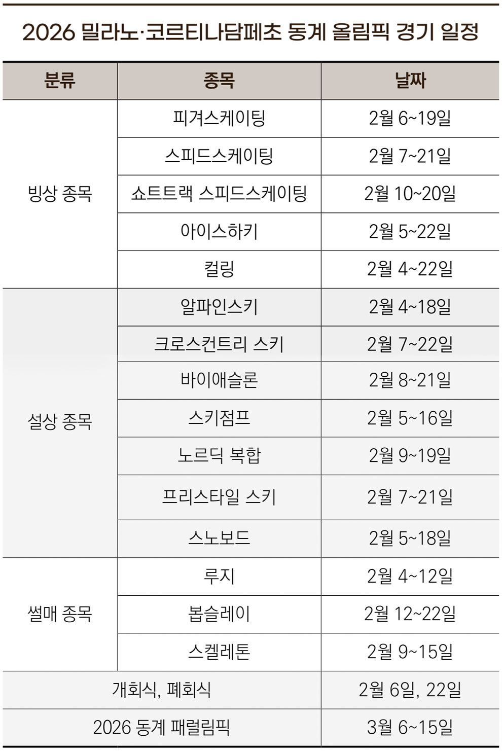 이번 대회에서 피겨스케이팅, 쇼트트랙, 아이스하키 등 주요 빙상 종목은 밀라노에서 열린다. 반면 코르티나담페 초에서는 봅슬레이, 컬링, 루지, 알파인스키, 스켈레톤 등 설상 종목이 펼쳐진다. 경기장은 이 두 거점을 중심으로 이탈리아 북부 알프스 전역에 넓게 분산 배치된다. 크로스컨트리 스키와 바이애슬론은 라센안톨츠 Rasen-Antholz에서 열리고, 스노보드와 프리스타일 스키는 리비뇨 Livigno, 스키점프와 노르딕 복합 경기는 프레다초 Predazzo에서 각각 치른다. 종목별 특성과 전문성을 최대한 살려 분산 개최하는 방식으로, 자연환경과 기존 경기장을 효율적으로 활용한다는 점이 이번 대회의 특징이다.